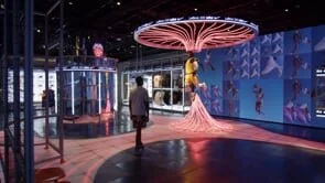 For the launch of the Lebron XXI at Nike’s House of Innovation in NYC, a series of flowing illuminated cables radiate from a full scale Lebron mannequin throughout the store, separating the space into programmatic zones and turning down in the form of a crown for King James. The cabling language is derived from the laces that run throughout the shoe, a large scale abstraction of the product’s key innovation.